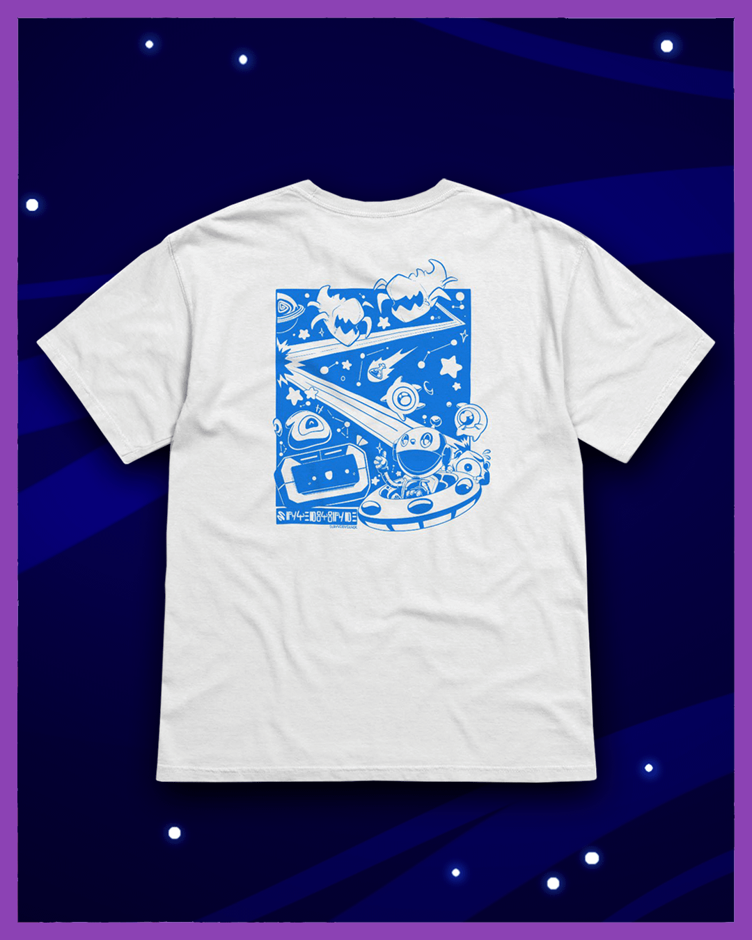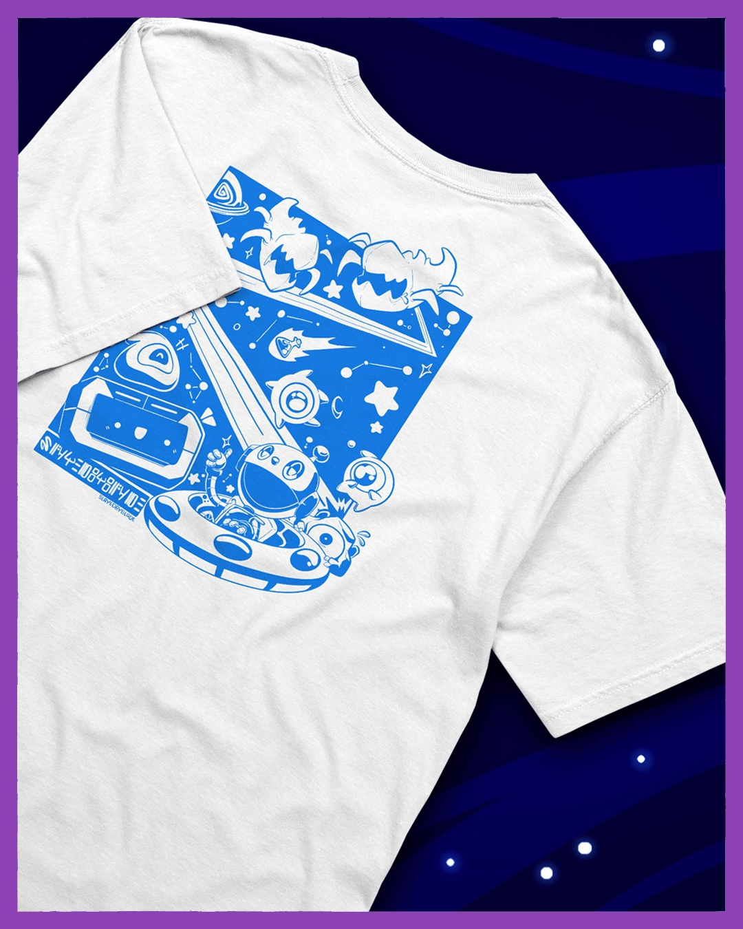 A solid white short-sleeved tee featuring an adorable linework illustration by Sarinjin in blue.